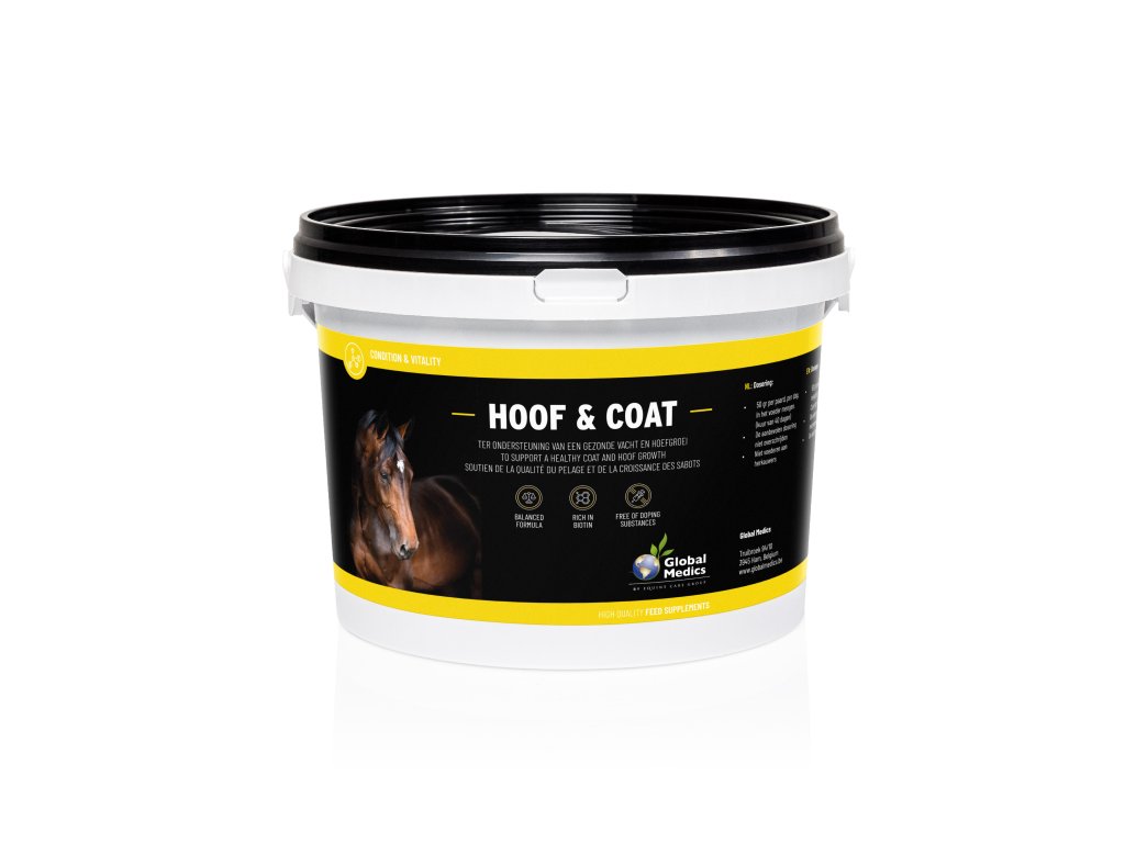 Hoof & Coat byl speciálně vyvinut k vylepšení kvality kopyt u koní. Mnoho koní má slabou kvalitu rohoviny, což vede k měkkým kopytům, lámavým kopytům, prasklinám a dokonce i k uvolněným stěnám kopyt. Hoof & Coat je ideální doplněk pro optimalizaci kvality kopyt. Kopyta rostou rychleji a kvalita rohoviny se výrazně zlepšuje.
